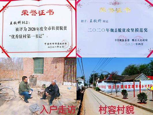 时代是出卷人,人民是阅卷人,他的答卷得到了当地政府和群众的认可,王秋科被魏县县委县政府授予了“2020年魏县脱贫攻坚模范奖”,被邯郸市委组织部授予了“2020年邯郸市扶贫脱贫优秀驻村第一书记”。